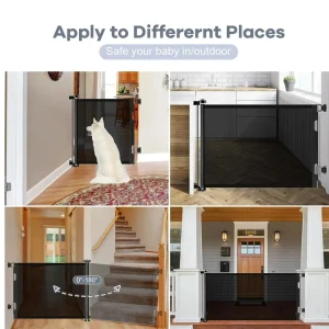 HDJ Extra Wide Outdoor Retractable Gate extends up to 71″ wide and is 34″ tall and includes components for easy installation: screws, catch mounts, wall spacer shims for the baseboards, and installation guides.