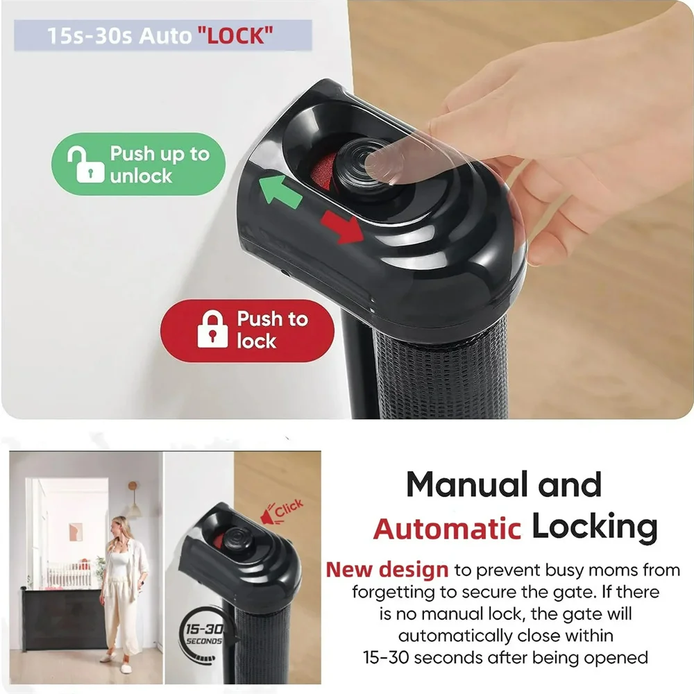 The simple 2-step operation allows you to open and close while holding your child: 1. Push, twist and release button; 2. Pull the handle to extend the gate, when the handle is released, gate automatically locks the release mechanism.