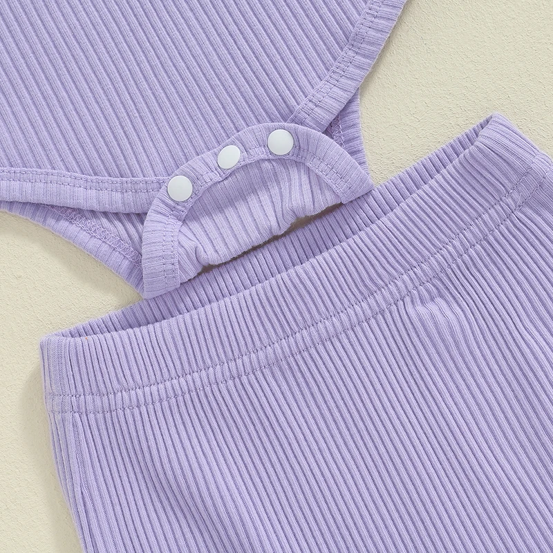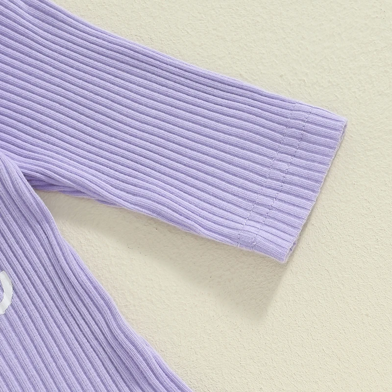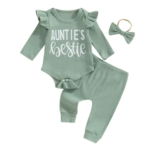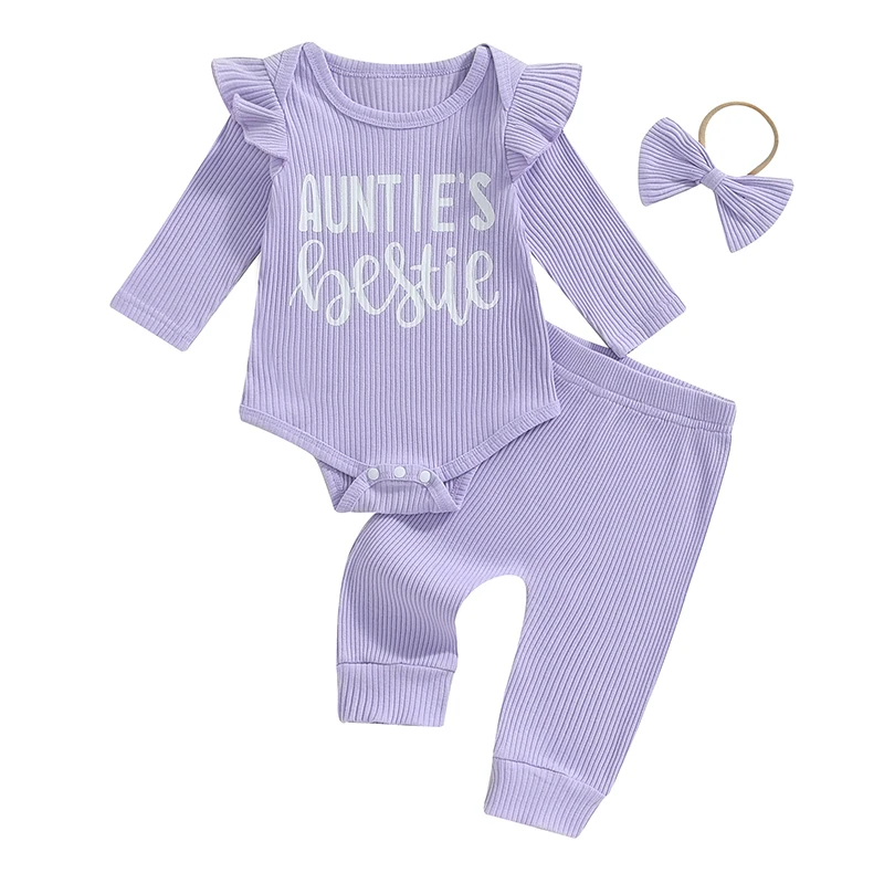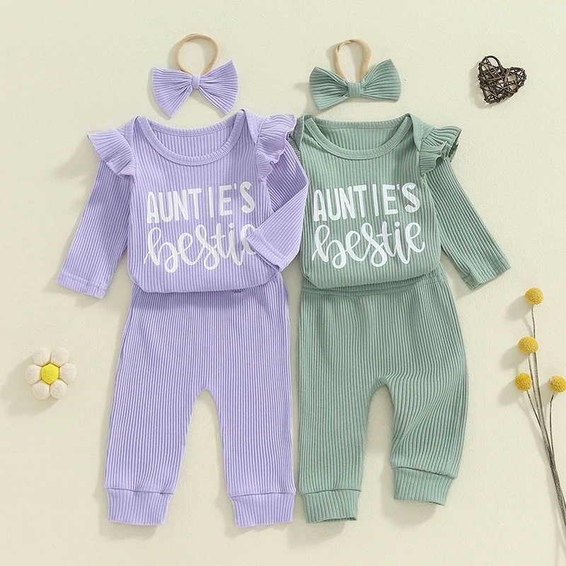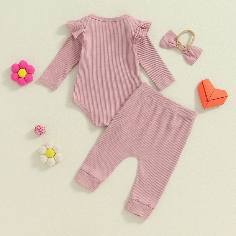3-Piece Baby Girls Ribbed Set Letter Print Long Sleeve Round Neck Ruffled Romper Long Trousers Hair Band Adorable Outfits