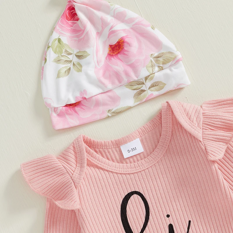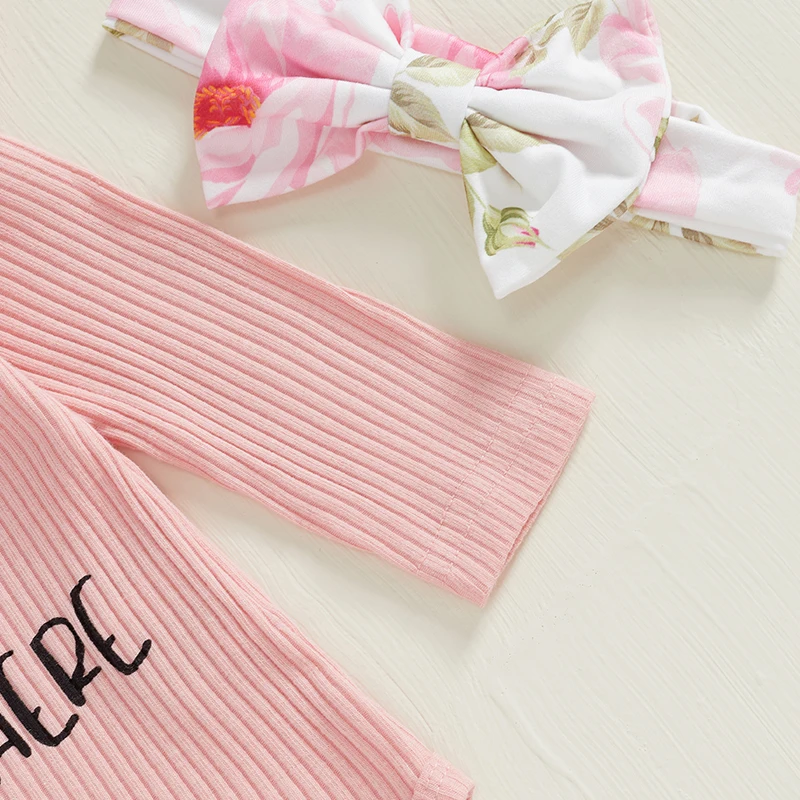 Baby girl romper with letter print, round neck, ruffles, long sleeves; Baby girl pants with floral print, cute bow, elastic waist design; And cute headband and hat set, make your little one cute and charming