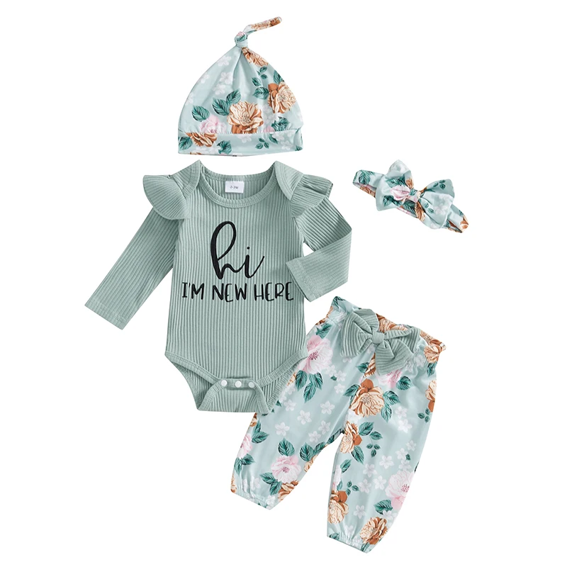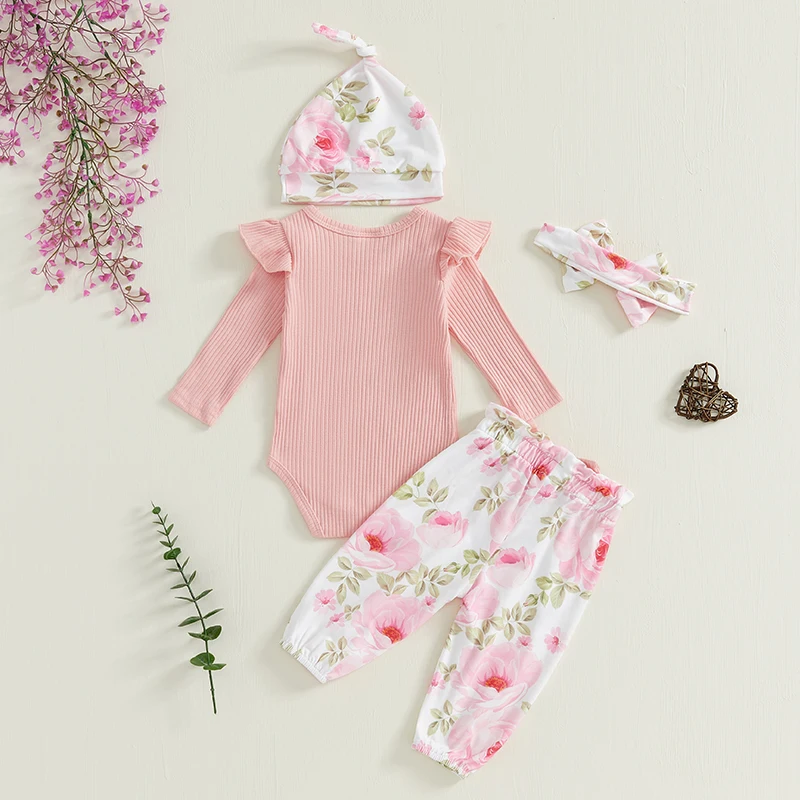 Baby Girls 4 Piece Outfit Letter Print Long Sleeves Romper and Floral Print Pants Headband Hat Set Cute Clothes
