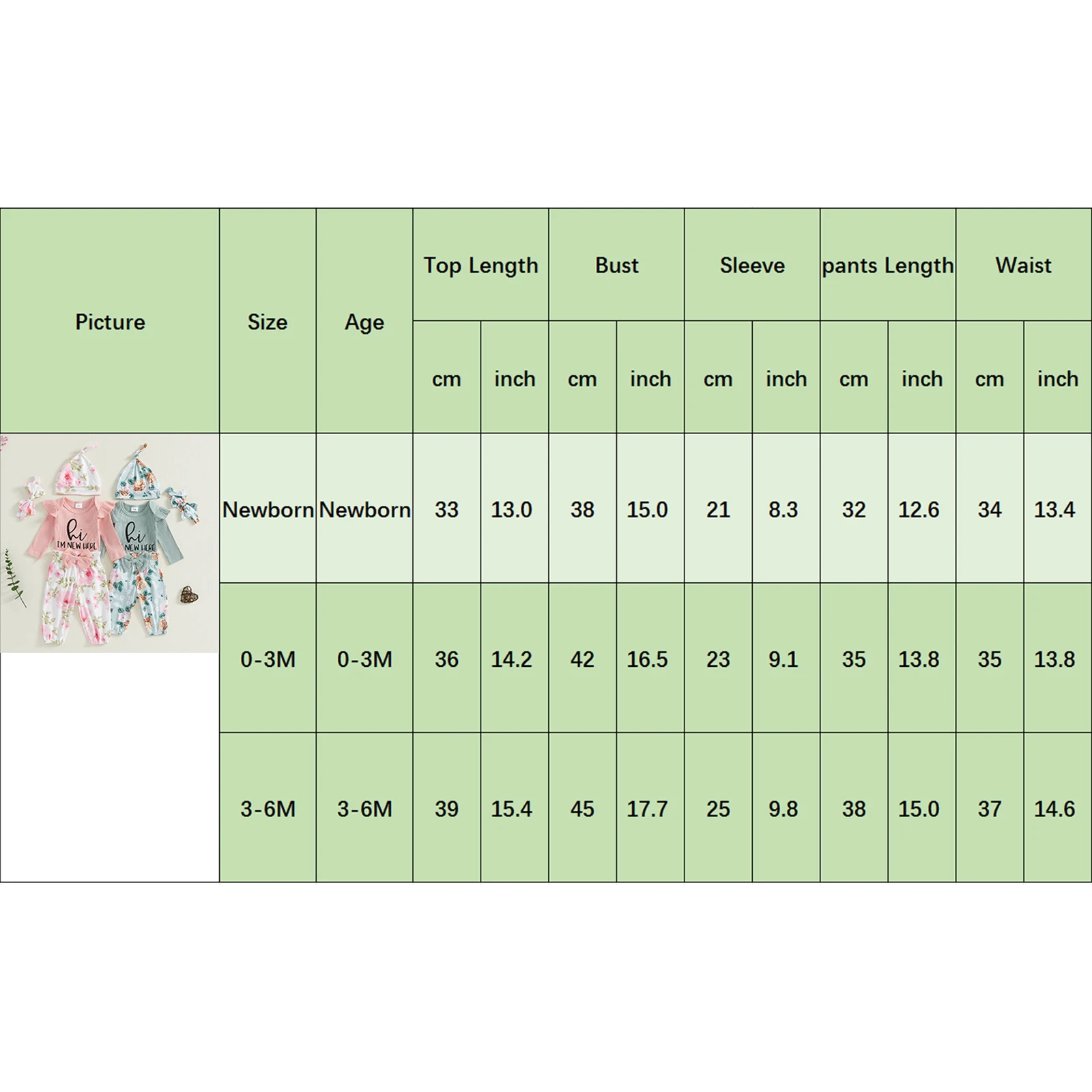3-6M Romper Length: 15.35 Bust: 17.72 Sleeve: 9.84 Pants Length: 14.96 Waist: 14.57 Advised Age: 3-6 Months